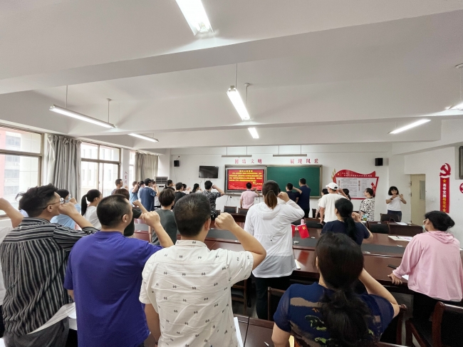 在劉良保的帶領(lǐng)下,全體教師高舉右臂莊嚴宣誓:遵守教育法律法規(guī),履行教書育人神圣職責(zé),落實立德樹人根本任務(wù)。遵紀守法,愛崗敬業(yè),為人師表,廉潔從教。誓言有聲,行動有力。