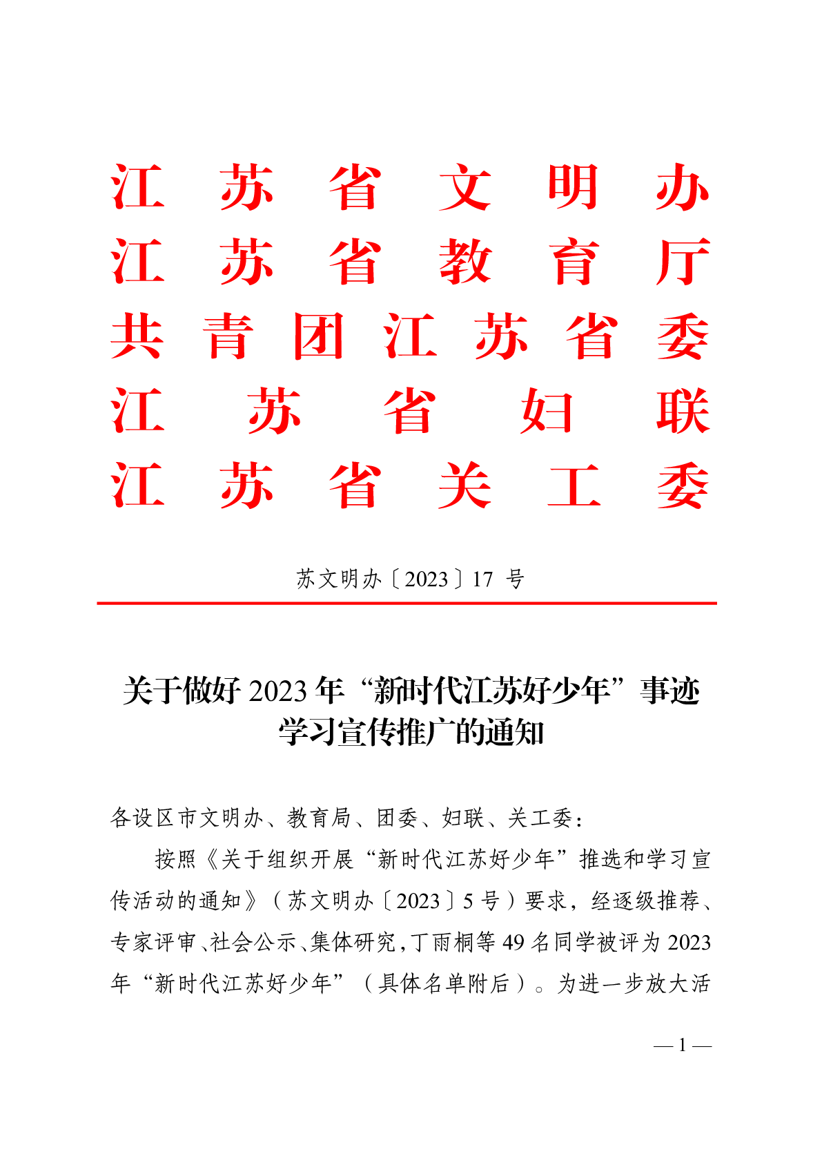 關于做好 2023 年“新時代江蘇好少年”事跡 學習宣傳推廣的通知
