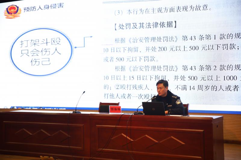 報(bào)告會(huì)由花果山派出所副所長任海洋作專題報(bào)告,報(bào)告主題為——加強(qiáng)自我防范,筑牢安全底線。任警官結(jié)合中職學(xué)生身心特點(diǎn),用身邊真實(shí)的案例,以案釋法,以法論事,深入淺出地給同學(xué)們作了生動(dòng)的報(bào)告,告訴大家在日常的學(xué)習(xí)和生活中,如何做一個(gè)“學(xué)法、知法、守法”的好公民。任警官結(jié)合中職學(xué)生生活實(shí)際,向同學(xué)們講述了刑事責(zé)任年齡的法律常識(shí),告誡同學(xué)們要增強(qiáng)法制意識(shí)、安全意識(shí),增強(qiáng)自我防范意識(shí),遠(yuǎn)離毒品,遠(yuǎn)離校園欺凌,不沉迷于網(wǎng)絡(luò)游戲,不因惡小而為之,做一個(gè)知法守法的學(xué)生,在陽光下健康成長。